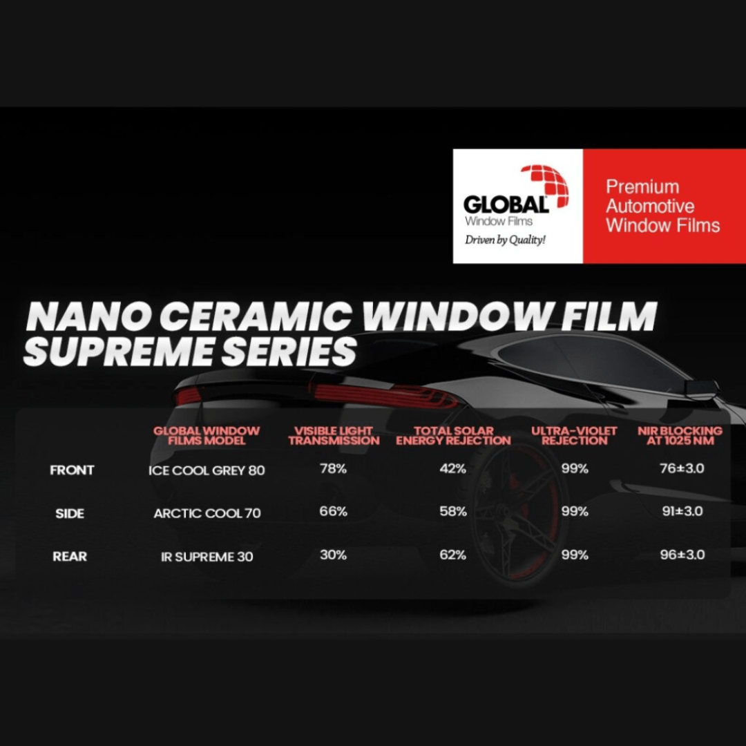 The epitome of window film, Supreme Series Nano-Ceramic by Global Window Films is an ultra high-performance automotive film which offers unmatched NIR blocking performance and exceptional solar energy rejection combined with a lustrous, nano-ceramic coating to deliver the ultimate top-pick while complying with the latest JPD VLT requirements.